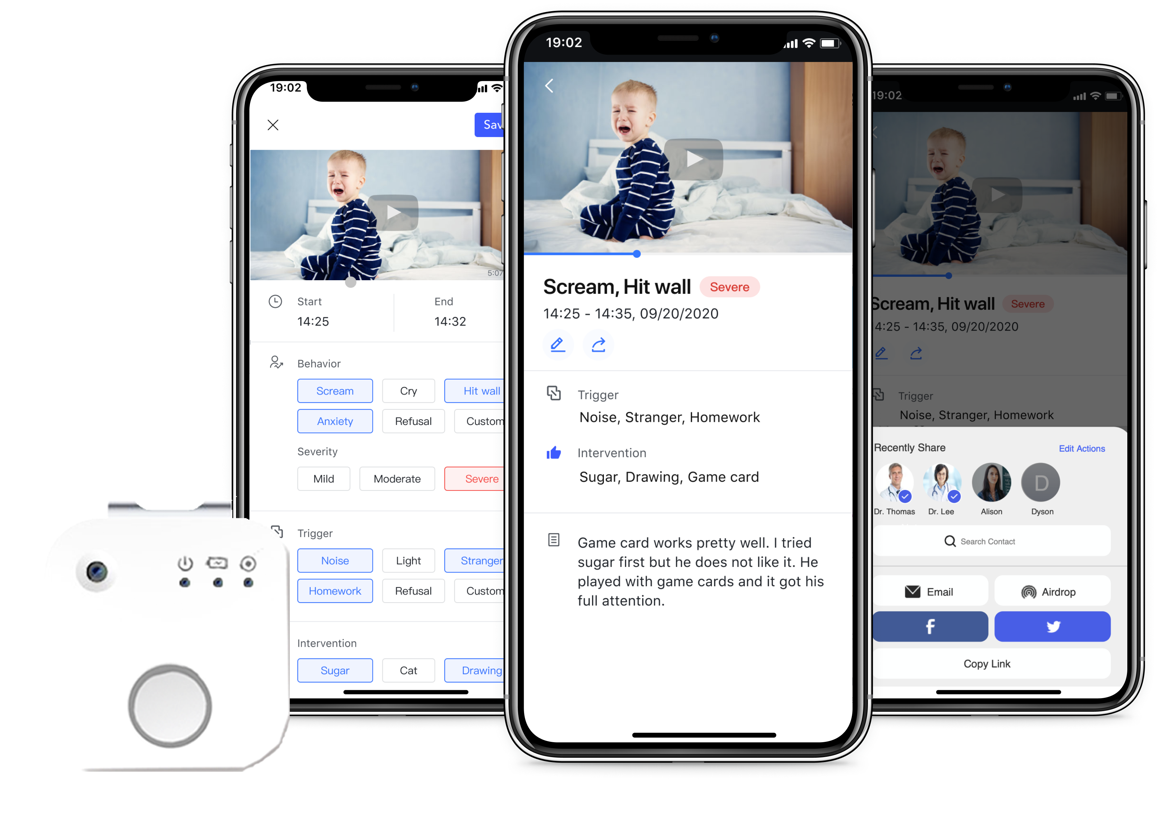 Every behavior has a trigger. Once activated, the CareCam device can keep recording audio data. When a behavior occurs and the parent presses the button, it will save the past 5 minutes of audio that was captured, and record video for an additional 5 minutes. When the CareCam device starts or stops recording data, it will vibrate to let parents know the status. Parents can input more details later, analyze, and share behavior data.